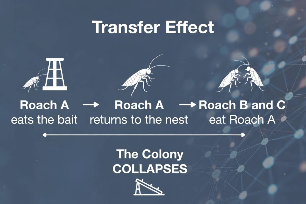 • The Domino Effect: Roaches are coprophagic (they eat feces) and emetic (they eat vomit). The poisoned roach returns to the nest and dies. Other roaches eat the carcass or fluids, ingesting the poison second-hand. One poisoned roach can kill dozens of others.